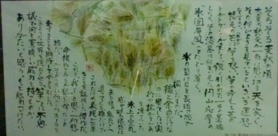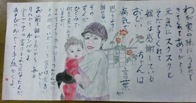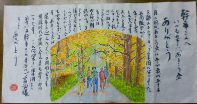 | 十一月は「霜月(しもつき)」霜が降り始める頃と言うことで霜月と呼ばれるようになったと言われています。十一月は他に 神楽月(かぐらづき)や雪待月(ゆきまちづき)等、十通りもの別名があります。漢字を見てそれなりの意味しか判りません が、どれもロマンティックな印象を受けます。今も昔も秋は何となくロマンティックなんでしょうか。 春の桜は「花見」というのに、秋の紅葉鑑賞はなぜ「紅葉狩り」というのでしょう。「狩る」とは獣を捕まえるという事ですが、 花や草木を探し求めるという意味もあるそうで、果物を採るときにも使われます。「りんご狩り」や「みかん狩り」等、やはり、 秋は狩猟のシーズンです。越冬準備の食糧確保や体力づくりにしっかり狩りをしなければならないという事から「狩り」と いうちょっぴり荒々しい言葉を用いたのではないでしょうか。 さて、今年で15回を迎えた「筆の里ありがとうのちょっと大きな絵てがみ大賞」は「ありがとう」をテーマに全国から作品 募集があり、わが「絵てがみ同好会」から7作品を応募しました。今年は10,847点の応募の中から2,523点の優秀 作品が選ばれました。絵てがみ同好会からは佳作1点、入選2点、入賞2点が選ばれ、昨年に引き続きりっぱな成果を 収める事が出来ました。佳作と入選作品は11/26(土)から12/25(日)まで熊野の「筆の里工房」で、入賞作品は同じ 期間に筆の街交流館「K−JIN」で展示されています。同好会では11/30全員で観に行きました。さすが「優秀作品展」 立派な作品ばかりで、今後の作品づくりに大いに参考になったのではないでしょうか。今年は3.11東日本大震災に関 する作品が多く胸を打たれる作品ばかりでした。みなさんも是非観に行かれてはと思います。今月は同好会メンバーの 優秀作品を紹介します。帰りに近くのレストランで食事をしながら感想を話し合い楽しい一時を過ごしました。 |