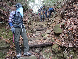 | 第110回12月忘年登山 「白木山」登山 広島市安佐北区 記:増田 隆治 【例会報告】 12月の忘年登山は、今年も健脚組(白木山・889.3m)/健康組(海軍山・514m)の二つのコースに分かれて実施。 【実施日】 2024年12月9日(月) 【天 候 】 晴れ 【参加者】 6名(女性1名、男性5名)(佐藤・新川・小森山・若月・梅田・増田) 【行 程 】 登り ⇒ 駐車場所 → 御木戸白木山登山口 → 穴地蔵 → 水場 → 山頂 下り ⇒ 登りの逆コース 【チェックポイント/タイム】 登り ⇒ 駐車場所 9:50 → 登山口10:17 → 一合目 10:26 → 二合目 10:38 → 穴地蔵 10:44 → 三合目11:07 → 四合目 11:26 → 五合目 11:34→六合目 11:42 → 七合目 11:52 → 水場12:02 → 八合目 12:10 → 九合目 12:19 → 山頂 12:33 下山 ⇒ 山頂 13:20 → → → → → → 登山口 15:05 → 駐車場所 15:20 所要時間 ⇒ 4時間48分 (昼食休憩47分を含む) (登り : 2時間16分 下り : 1時間45分) 歩数 ⇒ 16,000歩 【所 感】 ・ 今朝の東広島最低気温-1.0℃と冷え込んだが、日中は晴れで快適な登山日和であった。 (山頂近くで所々に雪が残っていました。) ・ 途中、トイレ休憩のユアーズ白木店駐車場で事故がありびっくり!(車の中で運転者が亡くなってる?警察車と救急車出動し 対応。) ・ 頂上の避難小屋の気温5℃、登りきった充実感と昼食弁当の美味しさは格別でした。 ・ 快適なコンデションに恵まれ、登りは適度に休憩をとりながら2時間16分、下りは疲れた身体に鞭を打ちながら ゆっくりと1時間45分で踏破。 ・ 毎年恒例の年末登山は同じ山を同じ時期に登り、自己の健康と体力チェックの定点観測の意味があります。 (今日の登山の感想⇒全員が楽しかった。 来年は如何ですか⇒」全員が登りましょう???) (昨年の登山と比較しての感想 ⇒ 余裕が二人、厳しいが二人、ほぼ同じが二人でした。) ・ 今年最後の山歩会、紅一点のSさん含め参加者6名全員 事故なく無事下山、みなさんお疲れさま & ありがとう! 別件(メモ) 一合目 二合目 馬の背 馬頭観世音 穴地蔵 不動尊 三合目 獅子の門 准抵観音 三.五合 釈迦の段 430m 四合目 別当松 勢至観音 五合目 天主の段 538m 六合目 桜の馬場 七合目 営門ノ段 八合目 風の穴 九合目 古家の段 十合目 以上 |