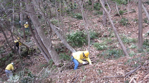 | 作業場への出発前に集合写真(クリックで拡大) | 作業風景① | |