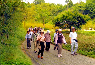 | 参加者あるこう会6名(男2名・女4名) 広島県竹原市の高崎町の場所にある竹原バンブー・ジョイ・ハイランドは、スポーツから文化まで楽しめる総合公園です。瀬戸内沿いのR185から少し山側に入ったところにあり、広い駐車場も備えられています。この公園の中にタケノコの形の「竹の館」という施設があり、竹工芸品が展示されています。また竹の館の周りには竹が植えられ、竹の生態も観察できるようになっています。竹原市という市名に関係付けた展示でしょうか。事前に選択されたコースをみんなで楽しくウォーキング。自然美あふれる自然環境の中 みんなでたのしく一日を過ごした。 |