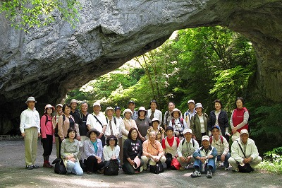 | あるこう会30名は乗用車6台で新緑の備後路を一路庄原市東城町上帝釈まほろばの里「時悠館」まで快適なドライブを楽しんだ。途中「よがんす白竜」で休憩し、新鮮野菜のお買い物を楽しんだ。時悠館の竹内さんの案内で、エントランスを入ると「時空旅行のトンネル」を潜って、古墳・弥生・縄文文化時代をパネルと実物で体感。帝釈縄文文化人と出会う一万年の旅を学んだ。時悠館前で記念写真の後、森林浴コースをウォーキングして、弥生食堂で昼食を楽しんだ。午後新緑の帝釈峡自然歩道入口で元気にストレッチして身体を解した。続いて次回持光寺コースの説明を聞いた後、帝釈川の渓流と新緑シャワーを浴びてウォーキングをスタート。鬼の唐門、白雲洞、鬼の供養塔、雄橋まで全員ウォーキングした。記念写真撮影後、弱健脚コースはUタウーン、健脚コースは断魚渓、マス養殖場まで行った。その先は道路工事中で行き止りの為Uタウーンした。帰り希望者は白雲洞へ入り、鍾乳石、石筍、石柱など自然の洞窟を観察した。まほろばの里へ戻り、帰路スコラ高原のハーブ館で、コーヒ&アイスクリーム休憩をして和気藹々に語り合った。帰路も同じ備後路を快適にドライブして無事東広島市役所に帰った。終日好天気に恵まれてさわやかなウォーキング日和であった。. |