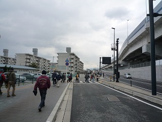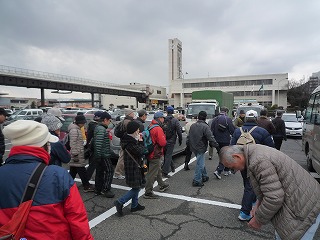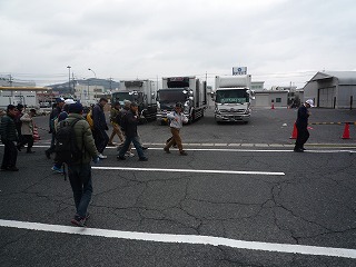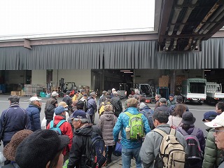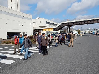 | 江波山気象館に向けてウォーク | ゆったり組はバスで江波山気象館へ | 職員の誘導で市場の出口に向かう |