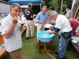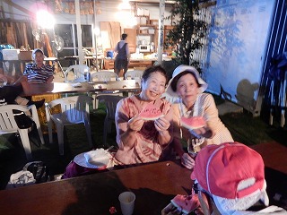 | ご機嫌のF&S氏 | スイカを準備する料理班の皆さん | |