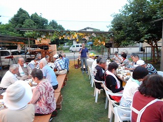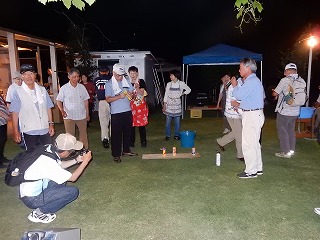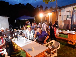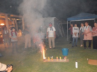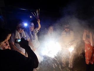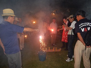 | 線香花火をする皆さん これで、夜間そうめん流し&バーベキュー夕食会は、ファイナルです。 | ||