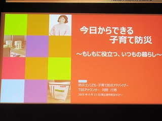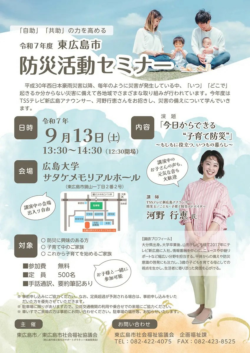 | 【第095回】 防災活動セミナー 藤井 良幸 ◎実施日:9月13日(土) 13:30〜14:30 ◎天候:曇り晴 気温28℃ ◎参加者:9名(男性7名+女性2名) ◎会場:広島大学サタケメモリアルホール ◎講演:防災活動セミナー「今日からできる”子育て防災”~もしもに役立つ、いつもの暮らし~ ◎講師:河野行恵(こうの・いくえ)氏(TSSテレビ新広島アナウンサー 防災士/こども・子育て防災アドバイザー ◎主催:東広島市/東広島市社会福祉協議会 ◎所感 最近ニュースで 各地の地震や集中豪雨などが報じられるが、TSSアナウンサーで防災士の河野行恵さんの 、 防災活動についての講演を聴いた。 第2子妊娠中のお身体でよく来てくれたと思いました。 講演内容は 一般的なむずかしい話ではなく、 家庭に特化した内容で講演してくれた。 簡易トイレでは 実際に見本を持ち込み、聴衆の子ども達に手伝ってもらいながら、組み立てかたや 凝固剤で固めて、 処分しやくする実験を見せてもらった。 家具の防震対策は、我々がチョっと気づかなかった注意点や、食料関係ではパッククッキングで あまり調理器具を、 使わずに日常に近い料理が作れることを動画で紹介してくれた。 市販の防災用品を実際のメーカー名も出して説明してくれてイメージがしやすかった。 |