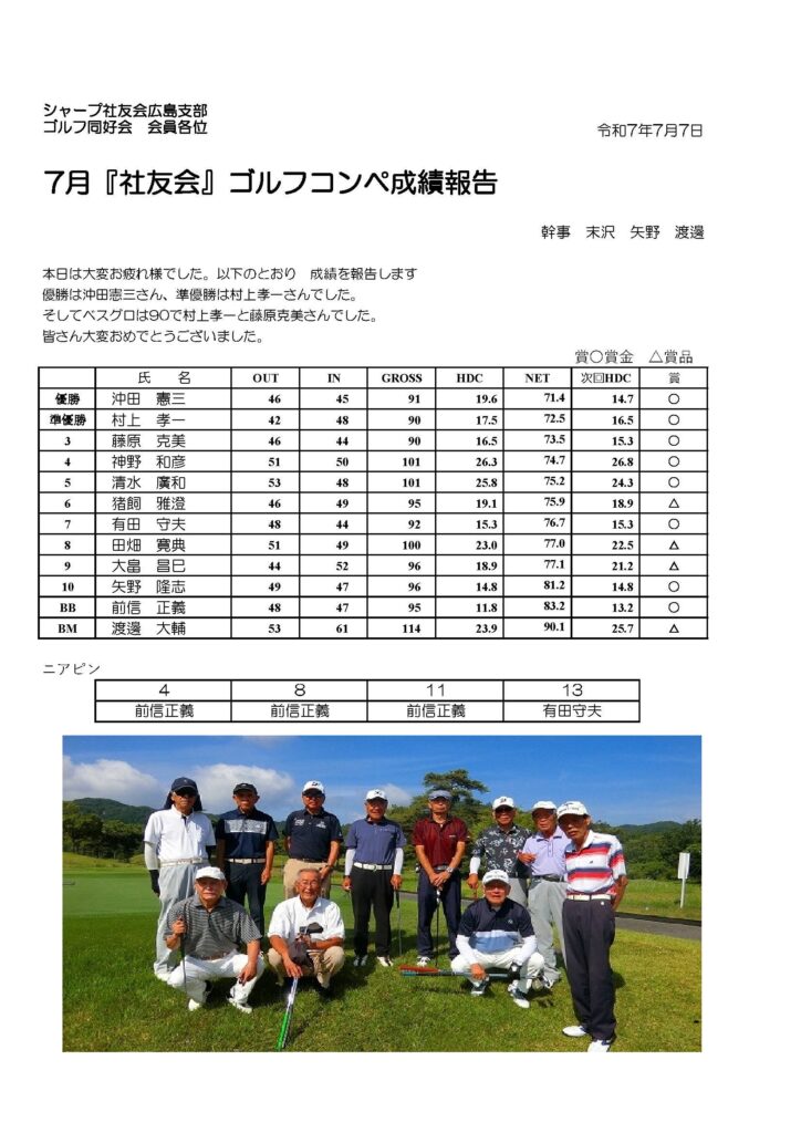 7月度(279回)社友会ゴルフコンペ成績について