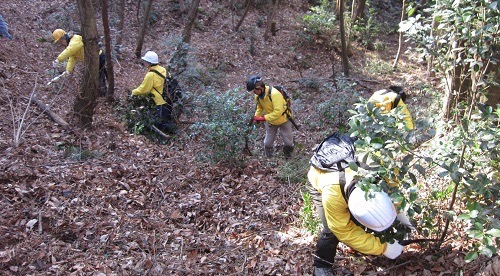 賀茂泉酒造(株)、賀茂鶴酒造(株)、山陽鶴酒造(株)、白牡丹(株)、JICA中国、(株)大成和、広島県立賀茂高等学校、農事組合法人アイ・おだけ、及び一般参加の皆さん等、約70名の参加で、約2500㎡の山林除伐作業を行いました。