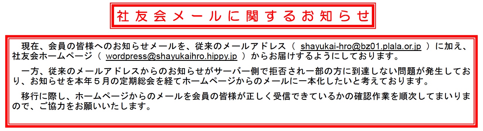 今後、会員の皆様への一斉ご連絡を社友会ホームページからお知らせメールに集約するにあたり、会員の皆様がメールを正しく受信できているかの確認をさせていただきたく、