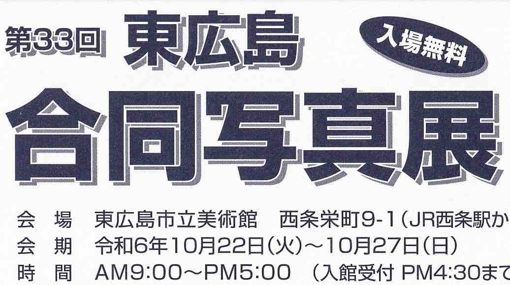 毎年秋に開催される恒例の東広島合同写真展、本年は10月22日(火)~10月27日(日)の6日間、東広島市立美術館で開催されます。
