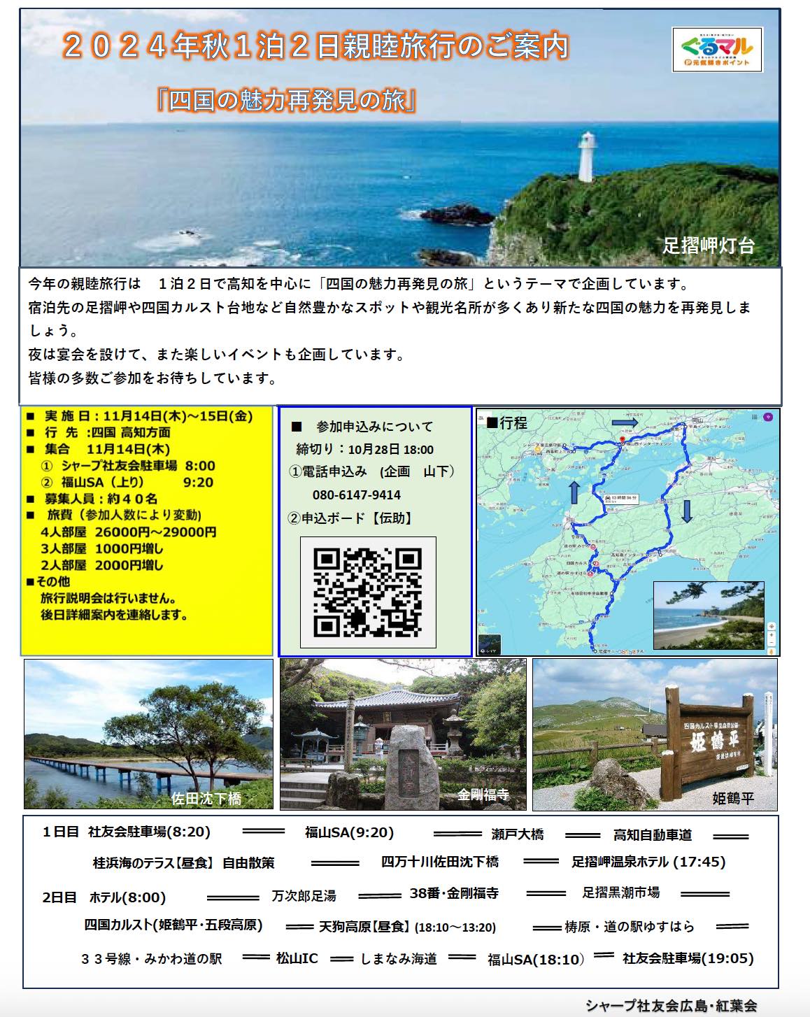 近場で行かれた方も多いとは思いますが「四国の魅力再発見」というテーマで高知を中心に1泊2日で企画します。行程は全てバス移動とし、宿泊ホテルは足摺岬で、宴会では楽しいイベントも企画していて、皆様の多数のご参加をお待ちします。