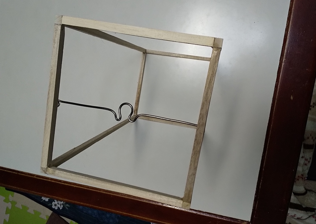 そこで、比較的簡単な木材を使った行灯型に計画変更。これなら特殊な治具も必要ありません。桐の8mm厚板を梅田工房で調達。これを、7mm角に加工して材料としました。7㎜角の棒を作るのは大変でした。後で分かった事ですが、市販の角材を購入すればもっと簡単に製作出来たと後悔。切断した材料を組み上げるのには、接合部真中に鉄針を入れボンドで接着しました。