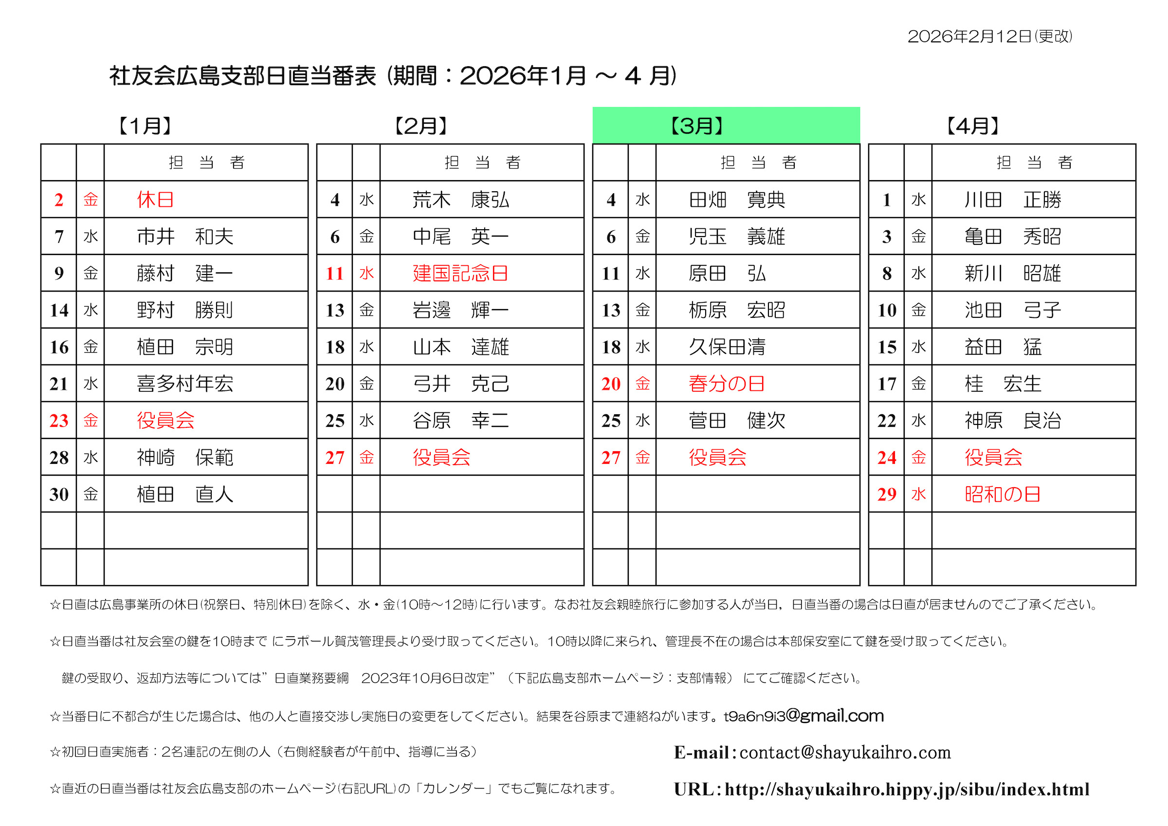 日直当番2024.03.192026.02.129月〜12月の日直当番表を更新しましたのでご確認ください。日直当番表日直当番業務報告フォーマット本日は日直当番ご苦労さまです配布棚を確認し、ご自分の資料があれば持ち帰ってください 件名日直年月日(必須)入室時間(必須)退出時刻(必須)日直者氏名(必須)メールアドレス 受領物無し有り シャープ社友会本部SFCゆうちょ銀行NTT東広島市役所 留守電入電無し有り来訪者無し有り外部よりの連絡事項無し有り役員への提案/連絡事項無し有り回答不要回答必要業務連絡事項無し有りΔ日直当番要綱日直当番要綱