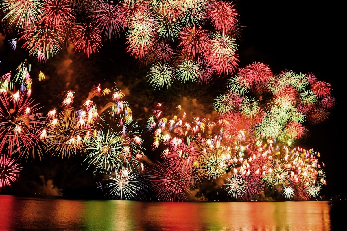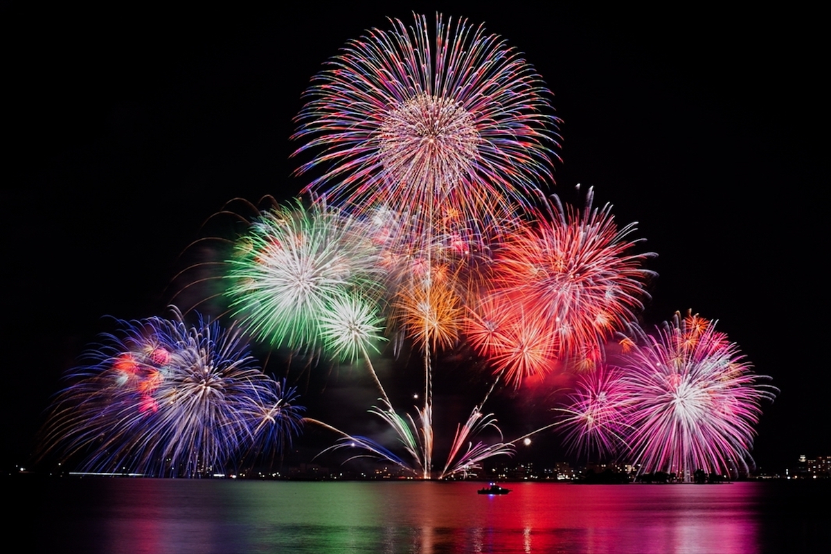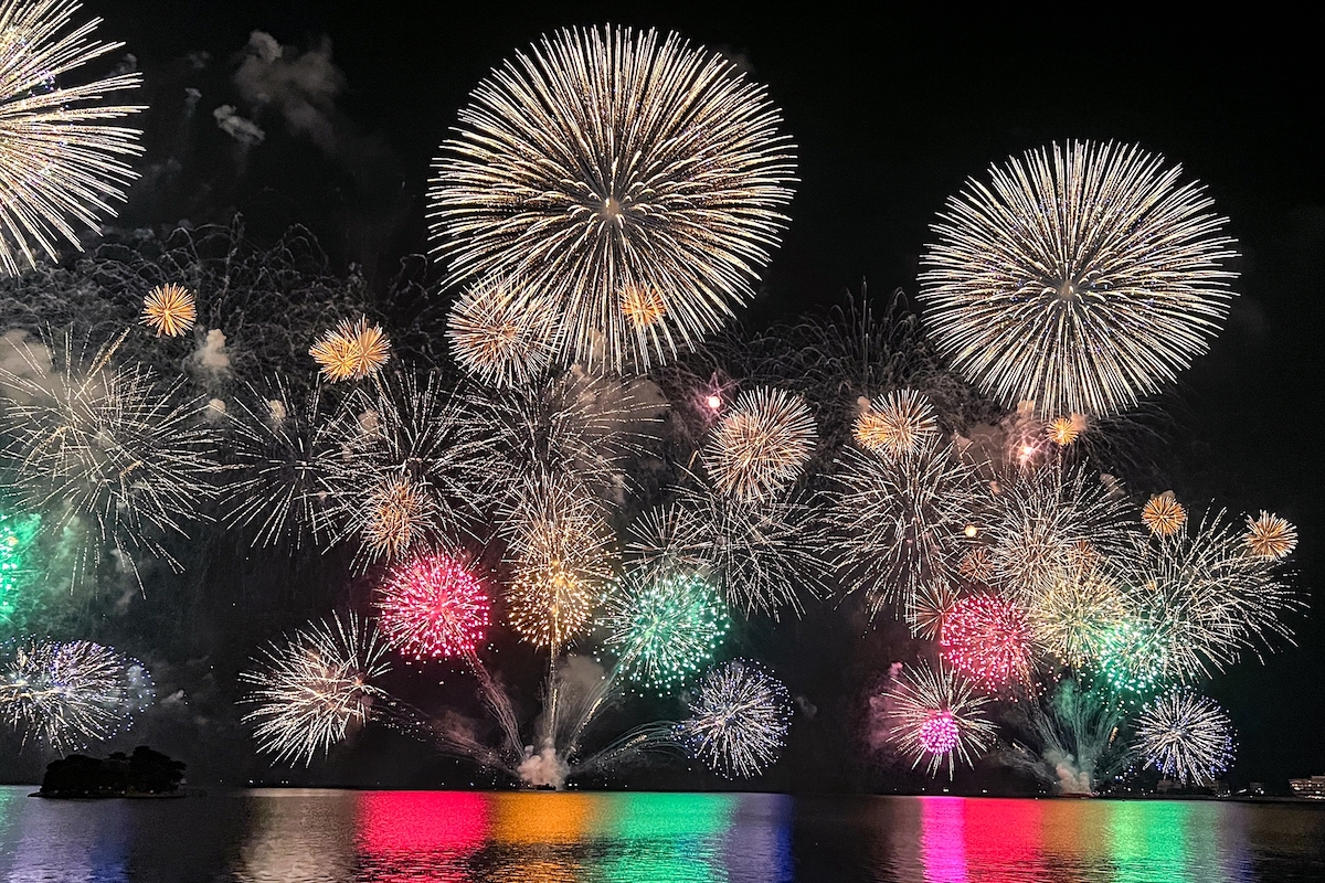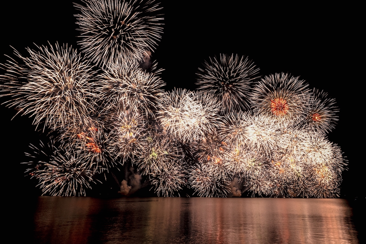 湖面に繰り広げられる華麗な花火ショーに感動。スマホでの撮影でしたが、湖面に写った花火の反射光を巧く撮ることができました。