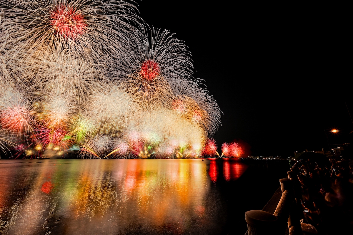 4台の台船から打ち上げられる花火は高さに加えて横の広がりも見どころ。これを15mm超広角レンズで捉えてみました。