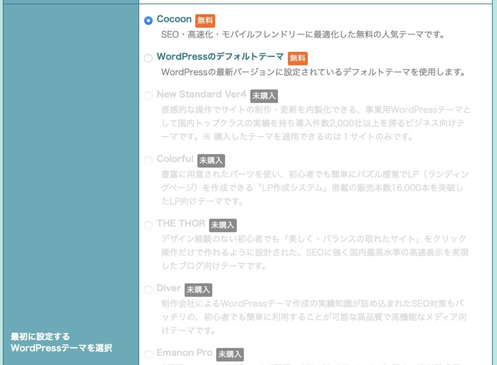 7) 「最初に設定するWordpress」に「cocoon」を選択ください