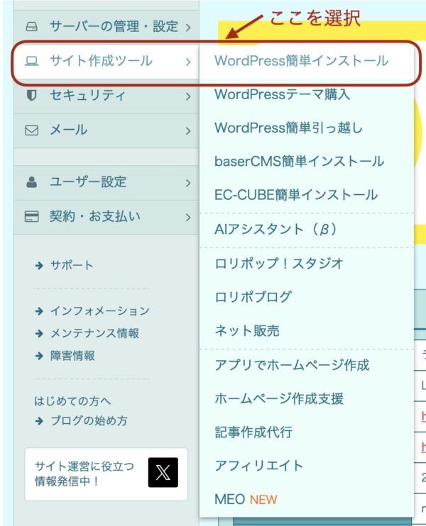 2) ログイン後 「サイト作成ツール」 → 「WordPress簡単インストール」 を選択ください。