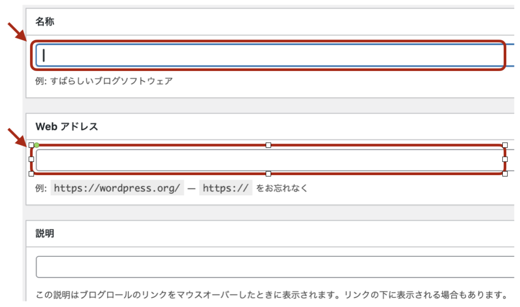 リンク先WEBページの「名称」と「WEBアドレス」を入力ください