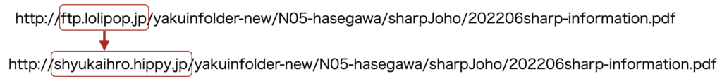 Word Pressの投稿又は固定ページのエディター上でリンクを貼る場合、コピーされたURLの ”ftp.lolipop.jp”部分 を ”shayukaihro,hippy.jp”に置き換えてリンクください
