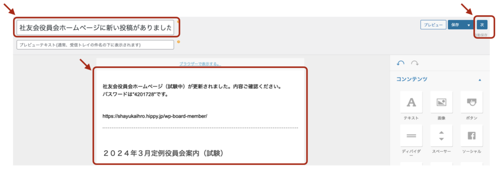 件名を選択してクリックすると下記画面が表示されます。この画面でこのメールの件名及びメール本文を修正することができます。 修正完了すれば「保存」及び「次」をクリックください。